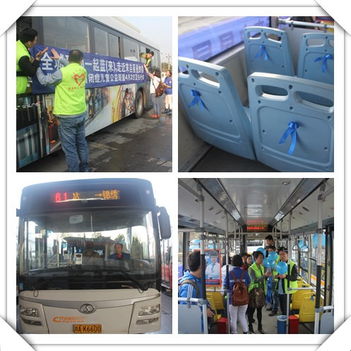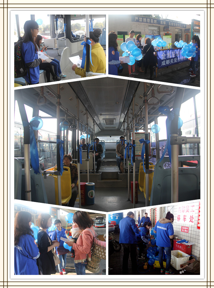昨日一早,在石羊场公交站内,来自543社工中心的社工们以及志愿者们忙碌地为61路公交车“穿上”蓝色衣裳,在椅背系上蓝丝带,栏杆挂上蓝色气球,车体外身拉上 “全城联动”的蓝色横幅;10名志愿者的胸前也别上蓝色蝴蝶结。这道“蓝色”的风景,立即引起市民的关注。