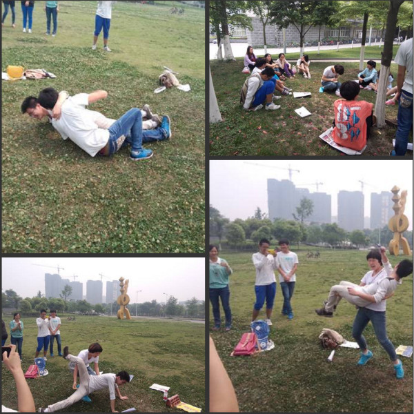整场交流联谊氛围三个部分,交流经验、互动游戏、参观校区。交流经验时大家都没有客气,各抒己见,将自己在志愿服务这段时间的经验教训都讲出来与大家分享。互动游戏分为上午的“萝卜蹲游戏”和下午的“杀人游戏”,气氛更是热烈,并且高潮不断。上午的萝卜蹲游戏,不仅有学姐公主抱学弟,还有来年各个男生拥抱激情翻滚,更有男女声错位假吻……