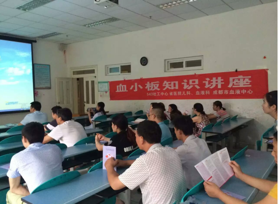 2016年7月12日,543社工中心驻省医院服务点联合省医院儿科、血液科,成都市血液中心在省医院护士学校举办了一场“血小板知识讲座”。来自儿科与血液科的20余名家属与患者在讲座中了解到输血小板的相关指针,互助献血政策等相关知识。