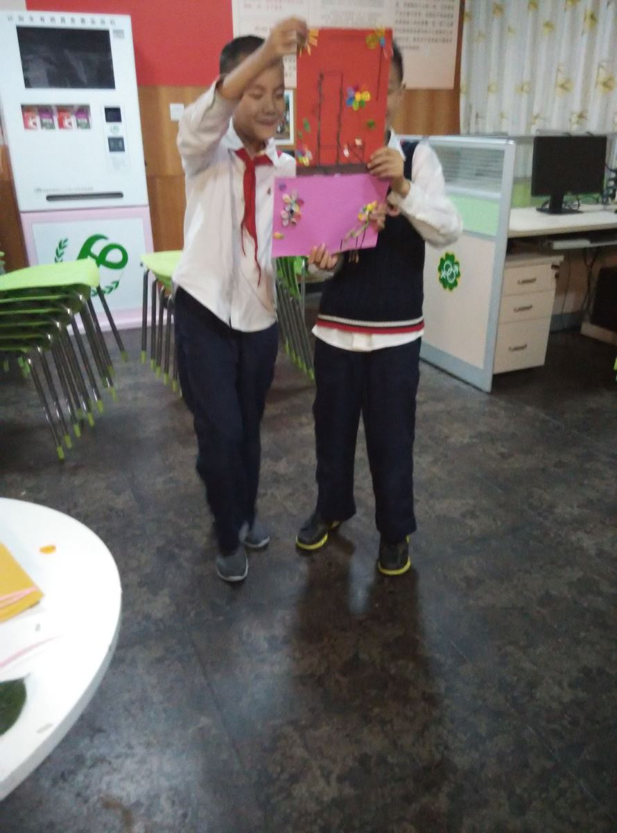 因着小朋友们已经有了一定的基础,在课堂中,志愿者老师不用特意从头开始教,而是以一个协助者的角色督促小朋友们一步步完成作品,今天因为参与的人数有限,六位小朋友共计完成3幅作品。通过小朋友们的努力,使得作品在颜色和形状上都变得更加丰满和鲜艳。在最后的分享环节,小朋友们也大方的向老师介绍了自己的作品。