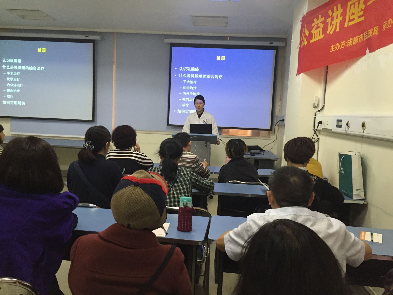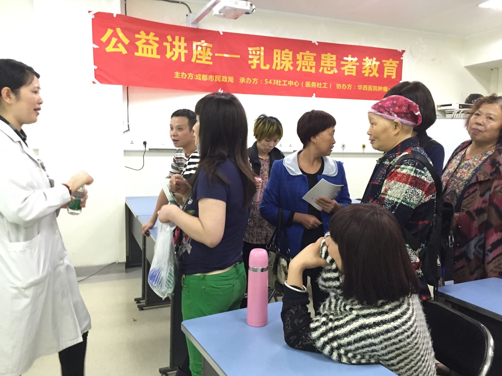2016年9月22日,543社工中心联合四川大学华西医院肿瘤一科乳腺组教授在科室B区示教室开展关于“乳腺癌患者教育”的讲座。旨在通过讲座,能让大家正确认识乳腺癌,减少因不了解乳腺癌而产生的恐惧和焦虑,从而保持积极的心态配合治疗。