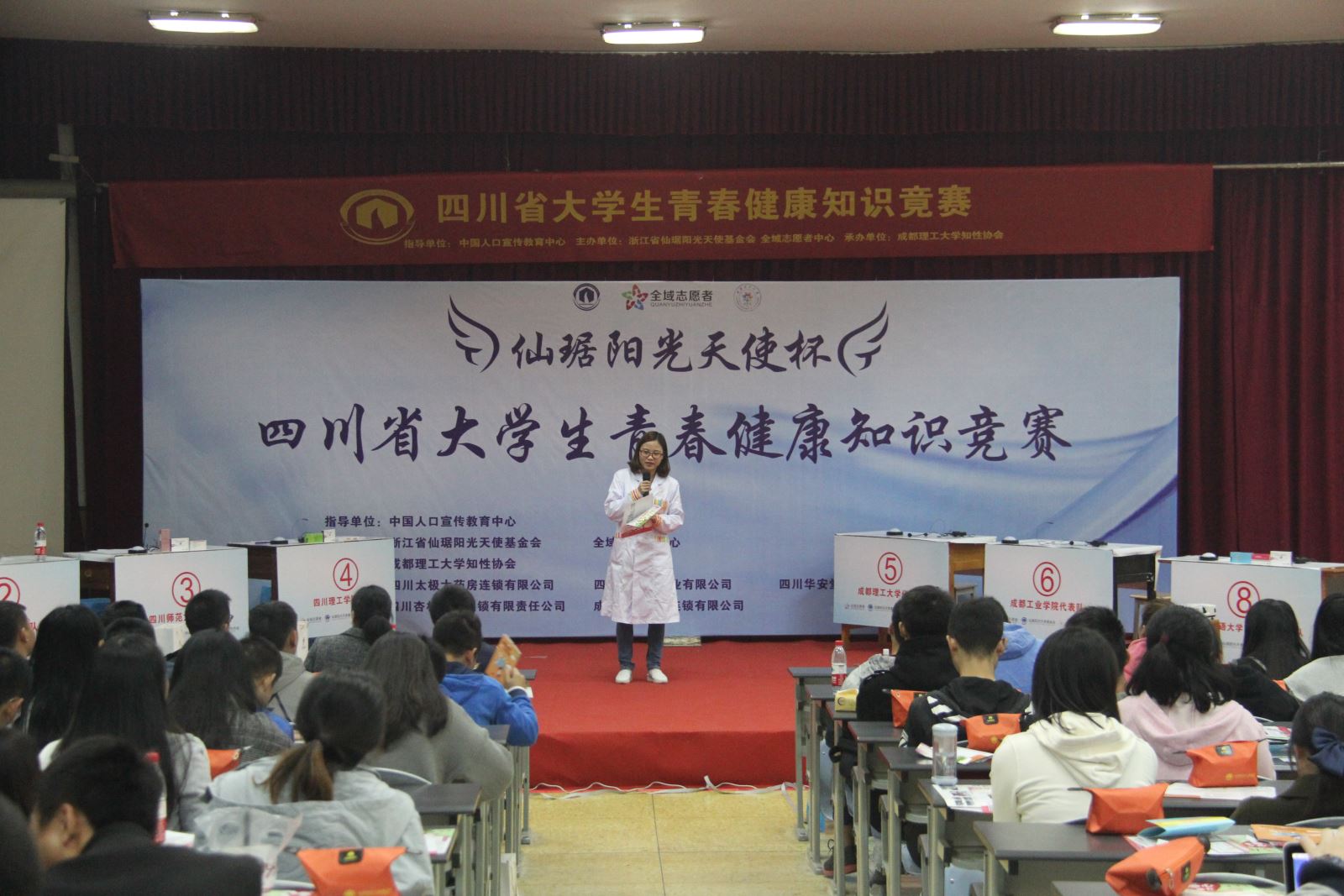 11月5日下午,在成都理工大学芙蓉餐厅三楼报告厅举办了一个关于“我青春 我健康 我快乐”为主题的“仙琚阳光天使杯”——四川省大学生青春健康知识竞赛,此次健康知识竞赛由浙江省仙琚阳光天使基金会、全域志愿者中心主办,成都理工大学知性协会承办,旨在让高校大学们认识有关‘性’的知识,做到保护自己保护别人。