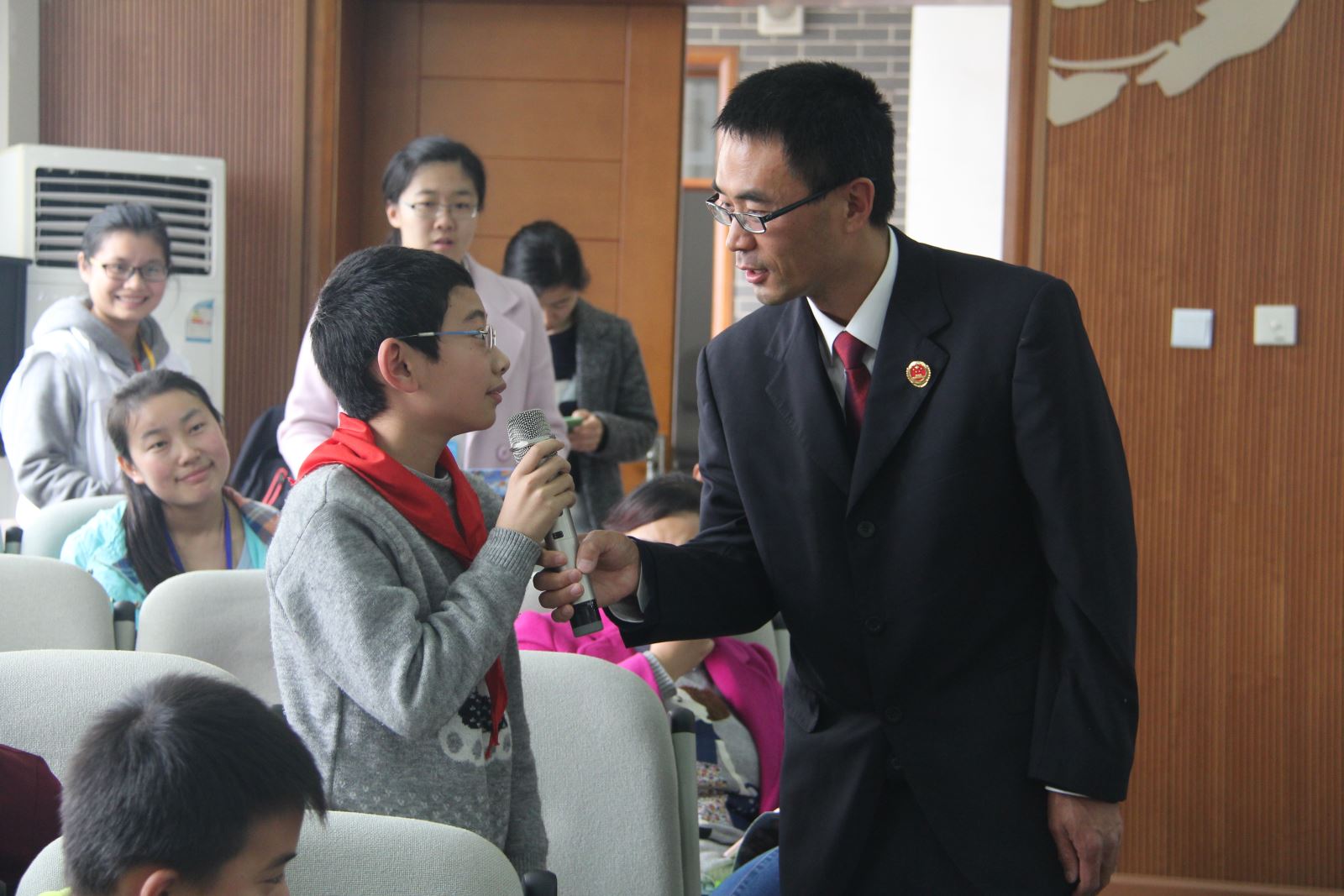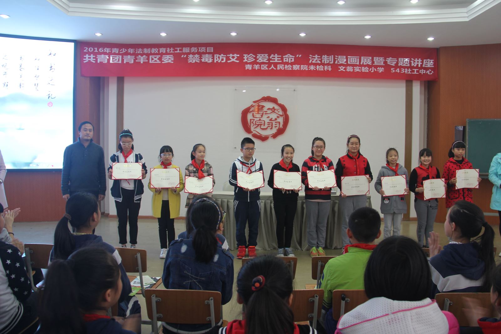 18日下午,由共青团青羊区委、青羊区检察院、青羊区教育局、区法院、区公安分局、文翁实验小学主办,543社工中心承办的“禁毒防艾 珍爱生命”校园法制漫画展暨专题讲座在文翁实验小学拉开序幕。此次“禁毒防艾 珍爱生命”校园法制漫画展暨专题讲座,是543社工中心今年开展的“模拟法庭进校园”法制宣传系列活动之一,活动通过法制讲座、模拟法庭、法制漫画展等形式,向小学生宣传法律知识,增强学生法制意识,提高法制观念以及自我保护能力,同时提高他们学法,懂法,守法,用法的能力。青羊区人民检察院未检科—王老师与魏老师、文翁实验小学校长—张涛、543社工中心副主任—张惠敏,也来到活动的现场与孩子们一起交流学习法制知识。