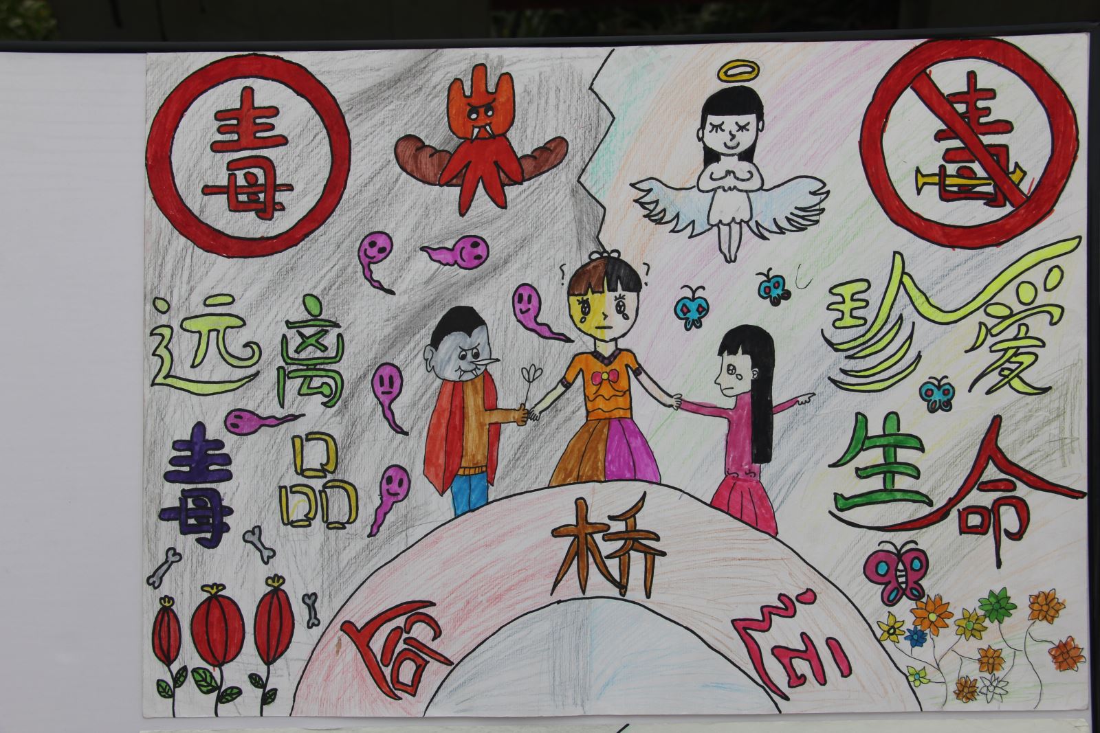 女孩站在生命桥上,眼角挂着泪滴,被天使和恶魔拉扯着,她的身子一半在人骨和幽灵那个毒品漫天的黑暗世界里,一半在花开遍地、珍爱生命的世界里……这一幅通俗易懂又具有警示意义的法制动漫作品,出自文翁实验小学六年级学生张思奇、隆青婷之手,这幅法制题材的漫画作品也在“禁毒防艾 珍爱生命”校园法制漫画展上荣获突破奖。张思奇、隆青婷和告诉我们,从构思到创作完成,用了不到半天时间,想通过这幅漫画告诉大家要珍爱生命,远离毒品... ...