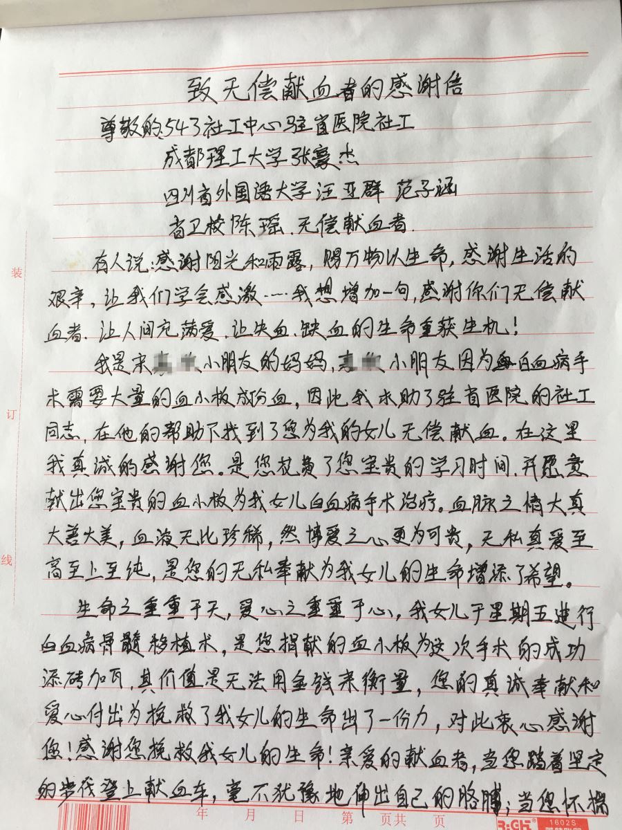 2016年10月27日、11月18日,四川省人民医院一名白血病患儿、一名心脏病患者手术急需血小板,但成都市血液中心暂时无法调配,患者家属不符合捐献血小板的标准。因此,患者的主治医生向543社工中心驻省医院的医务社工转介了这两位病人。社工得知后,紧急向省医院医务志愿者群发布招募捐献血小板志愿者的信息。志愿者们积极响应,最终有四位志愿者在社工的带领下到天府广场献血屋捐献血小板,其中3名志愿者成功捐献6个单位治疗量的血小板。白血病患儿在手术中已用了1个单位治疗量的血小板,手术成功后在重症监护室中继续治疗。白血病患儿已做过骨髓移植手术,需要继续观察治疗效果,何时使用血小板要视情况而定。患者家属非常感谢志愿者及社工的帮助,为此专门写了感谢信。相信在社工与志愿者的通力合作下,一定会将无偿捐献血小板工作越做越好。