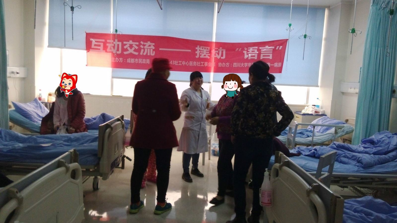 2016年11月15日,543社工中心医务社工事业部在四川大学华西医院肿瘤一病房举办了一次小组活动,活动名称为“互动交流——摆动‘语言’”。活动目的是让病人及其家属的心情通过参加活动得到放松,为病友间的交流提供机会,让病人通过与病友的交流获得心理支持,有助于病情的恢复。