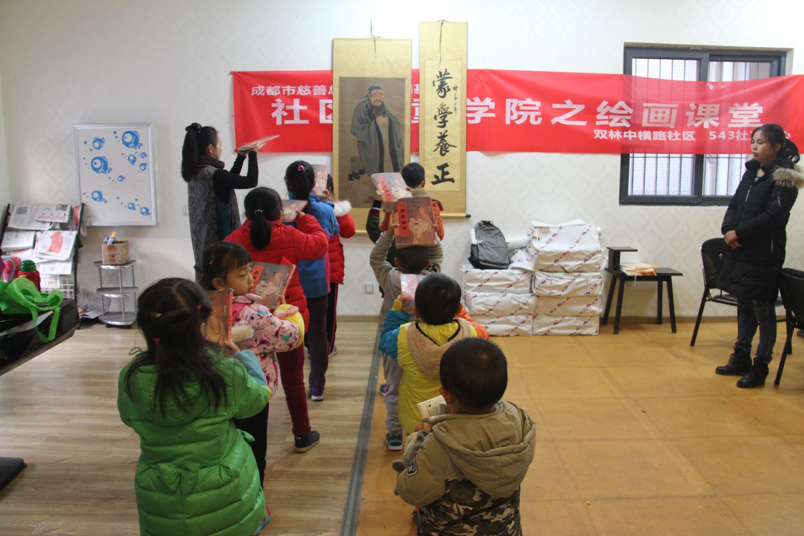 下午16::30,课堂接近尾声,孩子们怀着崇敬之情,双手捧书,举过头顶,向衣袖翩翩的孔子行礼致谢。