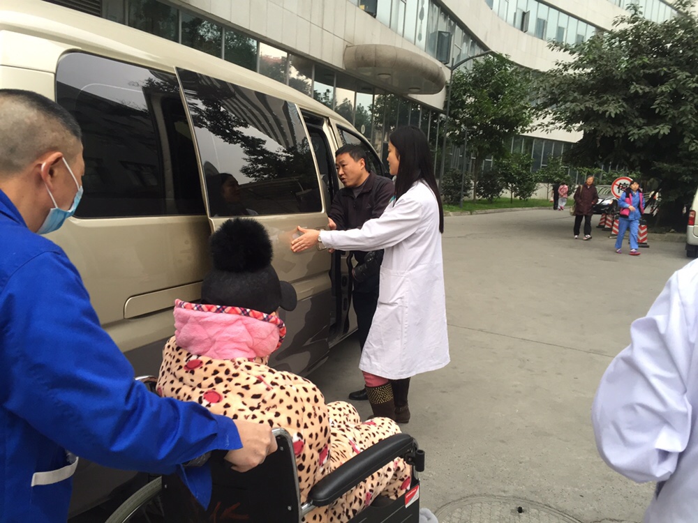 下午五点,543医务社工和爱心司机送杨冬玲去康复中心进行后续康复治疗。