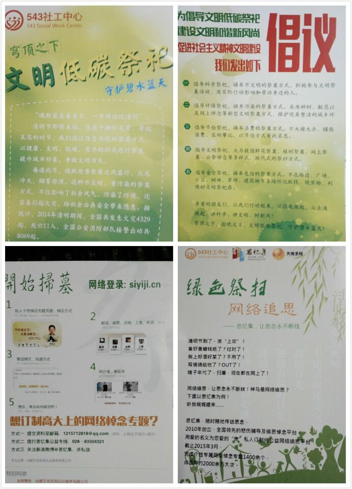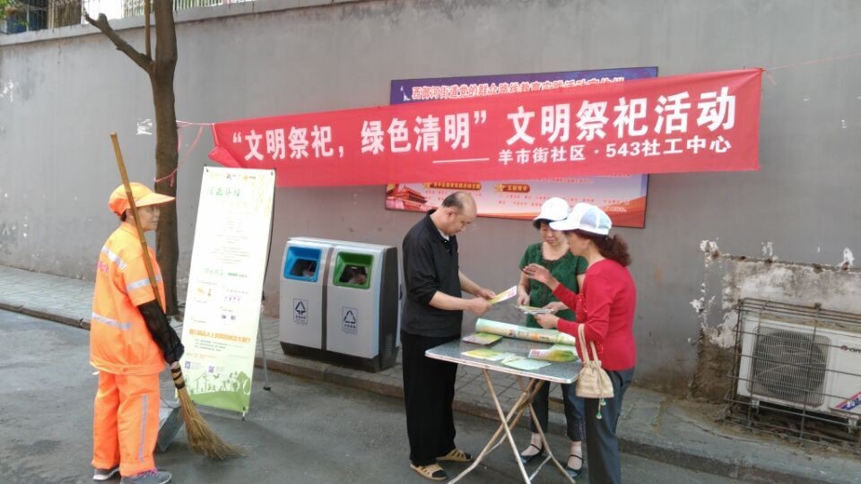另一支队伍则由543社工何琴带领,驻扎在羊市街社区,设立“文明祭祀,平安清明”咨询宣传台。为社区居民发放“文明低碳祭祀”DM单,以及网络悼念——思忆集宣传单。