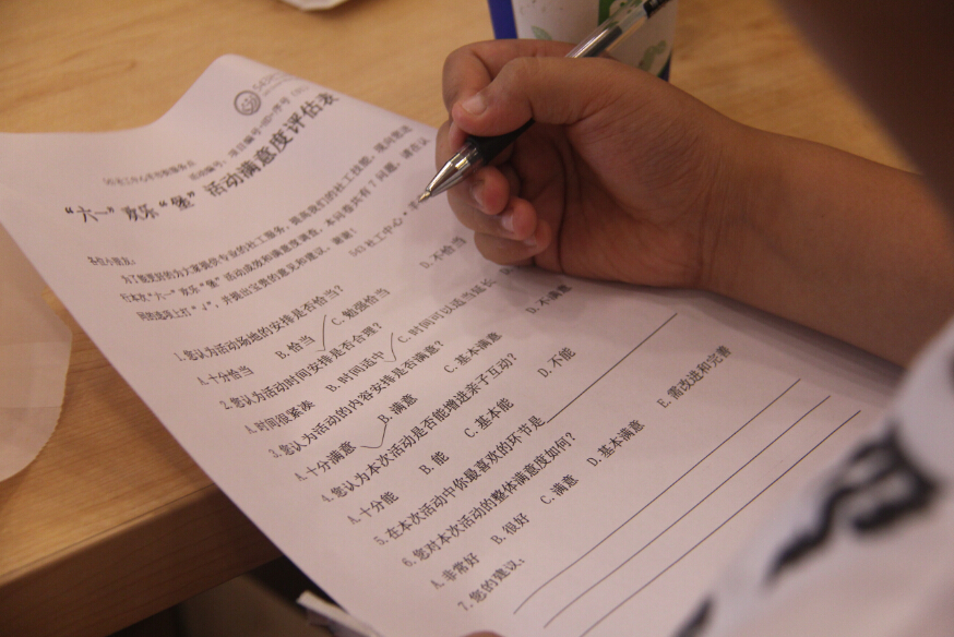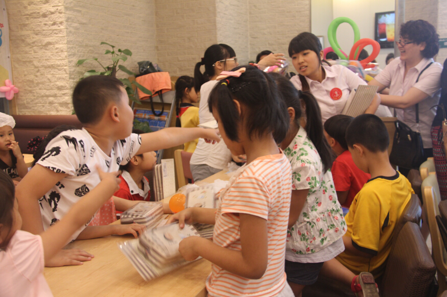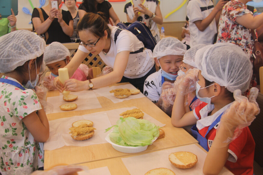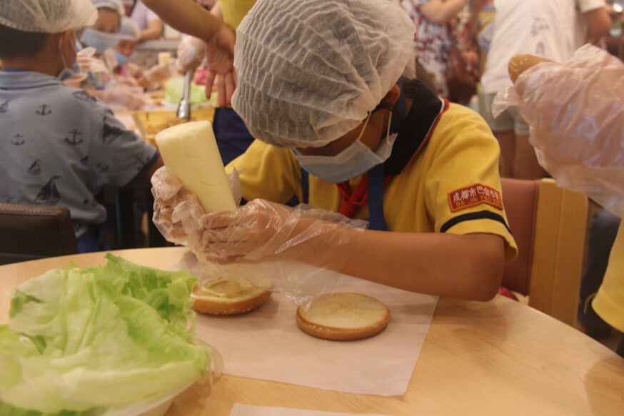 “小朋友们,先拿起面前有芝麻的半块面包放在薄纸上,像这样涂上黄油……”为了让孩子们将汉堡制作得更好,543社工请来了德克士经理为孩子们一步步示范。孩子们在欢腾而热闹的海洋中开始竭力创作,面包、黄油、鸡块、生菜按顺序组合在一起,出自孩子们手中的汉堡,丝毫不亚于专业工作人员的制作。要完整的制作汉堡,还需要最后一步,就是用薄纸将汉堡小心的包裹起来。