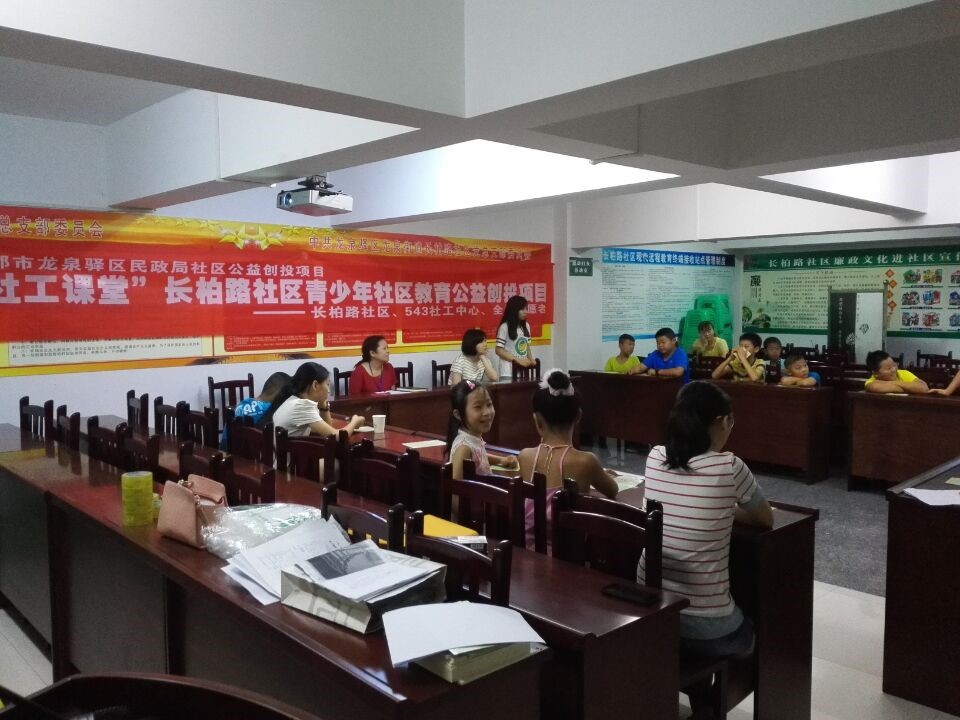 “社工课堂”——长柏路社区青少年社区教育公益创投项目是在成都市龙泉驿区民政局的资金支持下,由543社工中心携手成都市青羊区全域志愿者社工服务中心精心策划并实施开展的。立足社区开展青少年社会性发展、心理功能提高和社会参与三方面的社区补充教育活动,联合社区、家庭及社区内的其他力量,多方促进青少年的健康成长和全面发展,创建社区可持续发展的品牌教育活动,探索长柏路社区的青少年社区教育模式。