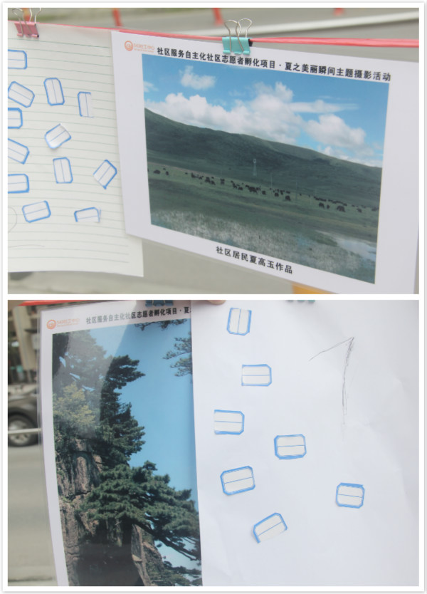 下午两点,社工与社区工作人员开始进行场地布置,拉横幅、设置画展、清点活动物资……前来参加活动的居民纷至沓来,现场一片沸腾。两点半,活动正式拉开序幕。社工主持人首先对活动内容及流程进行了简要介绍,随后邀请社区居民观赏参赛照片,并选出心仪的作品,投票火热进行中。