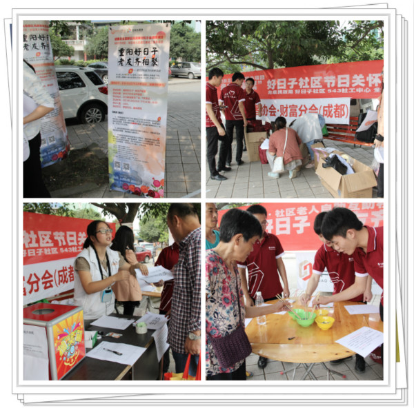 “一年一度秋风劲,岁岁重阳,今又重阳。”昨日下午两点,好日子社区老人自助互助社工服务项目“重阳好日子 老友齐相聚”社区敬老爱老活动于成都市龙泉驿区好日子社区恋日家园圆形广场盛大开幕!活动得到成都市龙泉驿区民政局、好日子社区及社区居民的大力支持,同时感谢华澳融信志愿者协会(成都财富分会)和四川师范大学志愿者的爱心支持!