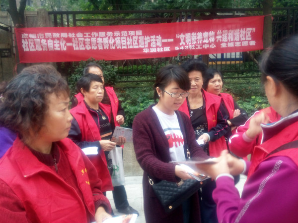 时装秀结束后,社工携手社区环保志愿队、高校志愿者分别走进华润各个小区,向居民们分发环保宣传单,宣传“文明豢养宠物 共建和谐社区”的环保理念,深受居民们的欢迎和认可!