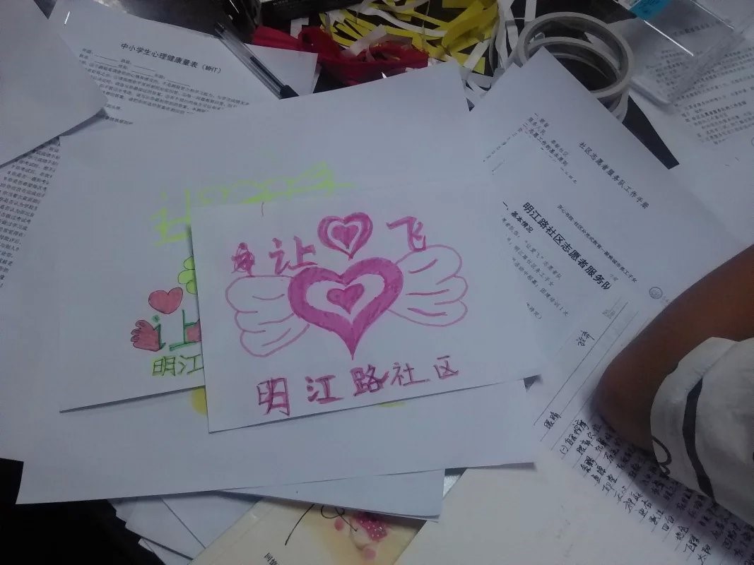 10月24日下午16:00,在成都市龙泉驿区明江路社区展开了社区志愿者队伍建设的准备活动,主要内容:“让爱飞”志愿者队标、队旗的设计和制作。通过前期的招募,一支10余人的社区志愿者队伍“含苞待放”。