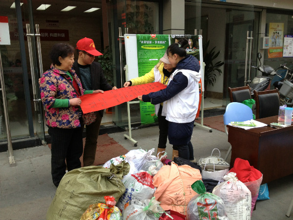 上午9:30,诸阿姨用三轮车拉来了十大包衣物,共有200多件,大部分是小学、中学年龄段的冬装。诸阿姨是府青路二段四号院落负责人,上周三社工与她取得了联系。