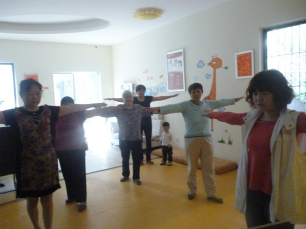 在欢快的音乐节奏中,婆婆们随社工一起快乐地跳起了健身操