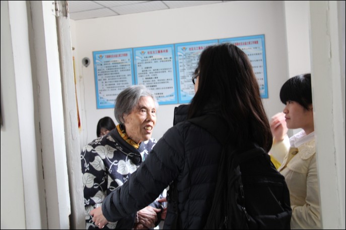 在进入社区丙区活动中心,偶遇一名前来咨询的老人,无国界社工热情的与老人攀谈起来