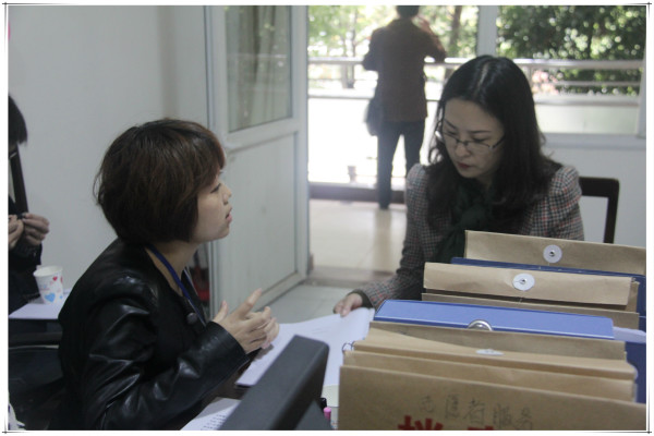 社工向成都市龙泉驿区民政局纪检组长陈虹(右)汇报社工工作