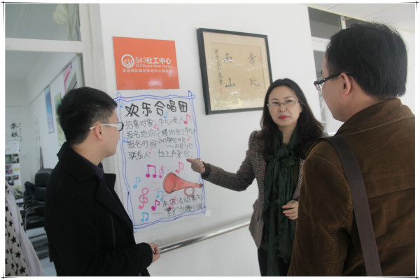 驻点社工向陈虹组长等领导展示了同行者、心灵关爱项目及各活动策划书、反思报告等资料,详细介绍了社工在养老中心开展的一系列敬老爱老活动以及与老人和谐相处的心得体会。“社工作为当今社会公益事业发展的新起力量,在入驻养老中心的两年里,为院内老人们做了不少好事,对老人的身心健康发展起了积极的推动作用!”陈虹组长对社工工作给予了充分的肯定。针对社工为老人建立个人档案并以院内老人的实际情况(多为农村五保户)为基础开展有益身心健康的活动,陈组长表示大为赞同。