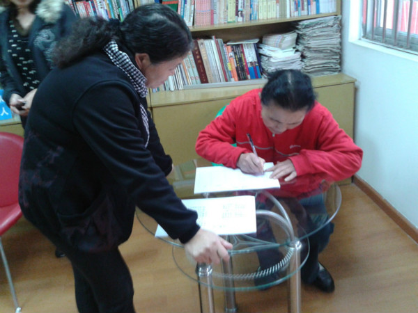 社工引导两位新成员进行登记