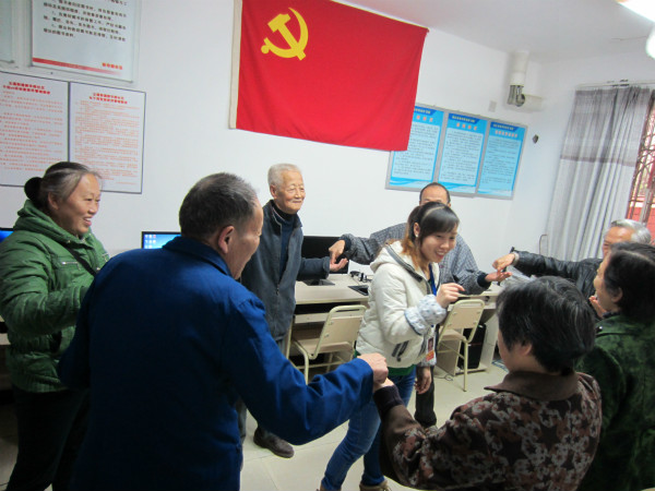 电脑小组活动开始前,社工陪老人们开心地进行热身游戏