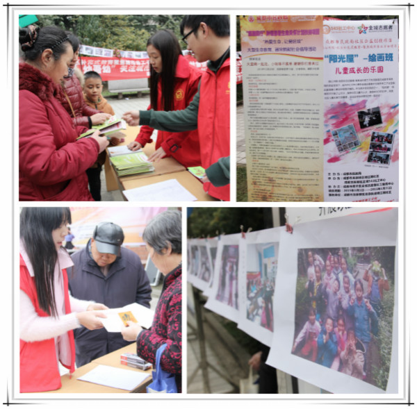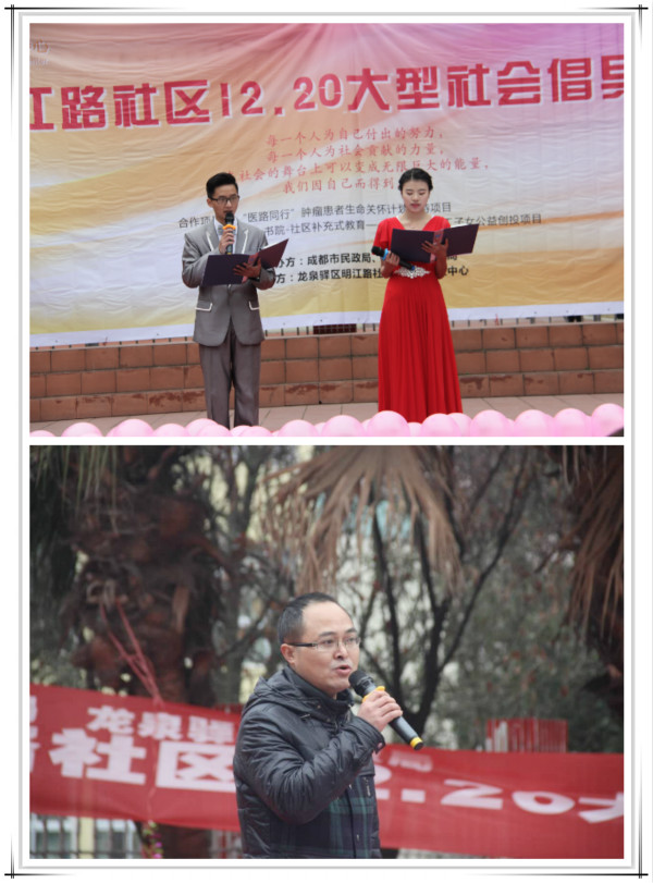 2015年12月20日,开心书院—社区补充式教育—聚焦城市务工子女项目携手“医路同行”肿瘤患者生命关怀计划扶持项目在成都市龙泉驿区明江路社区甲区休闲广场盛大举办了大型社会倡导活动。
