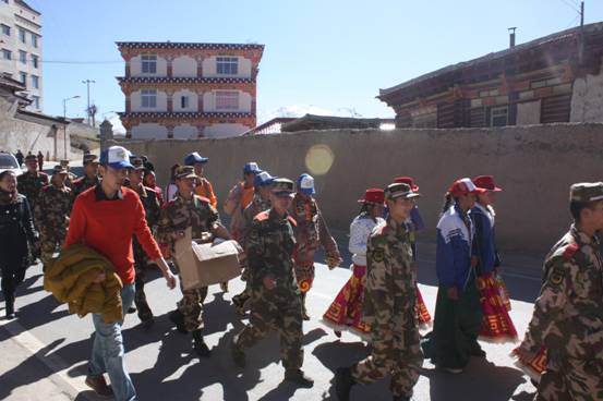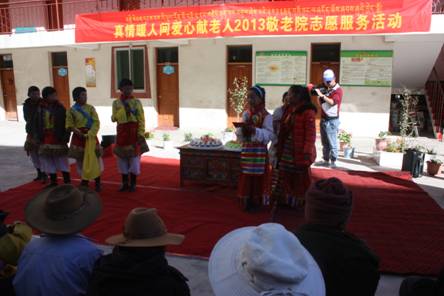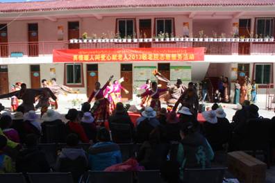 活动当日,在县团委和我中心驻点社工的组织和筹备下,7名青年志愿者、三完小学和民族中学的同学们以及驻县部队的15志愿者一同来到甘孜县中心敬老院。到达敬老院,所有的志愿者开始有条不紊的按照事先计划进行着。孩子们和志愿者先是细心的帮助老人们整理内务:叠叠被子、扫扫地、擦擦窗户……还有些志愿者就陪着老人们唠嗑、闲聊。打理好了房间内,接下来就是志愿者的表演时间了。表演者们穿着精美的藏服载歌载舞,一个舒展、一个屈膝、一步踢踏,无一不是带着满满的尊敬和爱意,孩子们主持的有板有眼也博得了老人们的阵阵掌声和无尽欢笑。