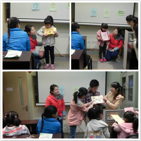 教学活动正式开始,首先我们对孩子们的坐位进行了调整,让“星儿”有更多的机会接触到普通的孩子,在课堂中相互学习,提升自己;接着,老师展示了自己做的粘贴画,并教给孩子们正确的制作方法和流程;然后按照制作的步骤依次分发纸、笔、剪刀、双面胶,指着瓦楞纸揉成的条以及剪的小颗粒;最后,老师让孩子们举手主动上台展示自己的作品,有了社区里普通孩子的榜样作用,“星儿”不再需要志愿者和老师的不断鼓励就可以勇敢地上台展示自己的作品了。