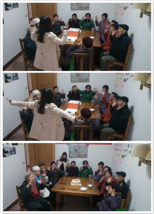下午一点半,在爷爷奶奶们的建议下,生日会提前开始了。首先是热身活动——“笑口常开”,让现场的“家人们”动手动脑,笑料百出,气氛十分活跃。在生日歌声中,点蜡烛、许愿望、分蛋糕、送祝福,一切都沉浸在欢声笑语中。最后在大家的合照中,本次生日会圆满结束。