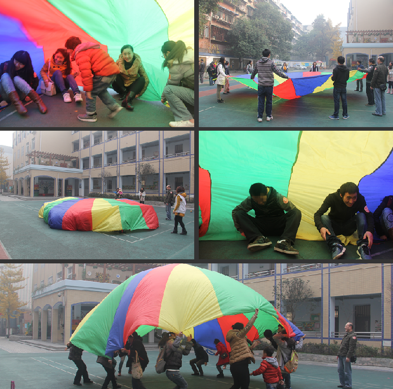 表演完了,随后便是激烈的有奖知识问答,做完答卷的便和“星儿”们玩游戏: 蒙古包、彩虹桥。游戏时,每个人抓住彩色园盘的每一个角齐心协力用力向上举,再同时钻进帐子里,看能坚持多久。这个游戏是既好玩,又能让“星儿”参与其中不再是做一个孤独的局外人。彩虹桥更是让一个小“星儿”玩儿的乐不思蜀了,一个人站在中间,然后由大家合力把彩虹拎起来,彩色条纹此起彼伏,真像雨后天空出现的彩虹。