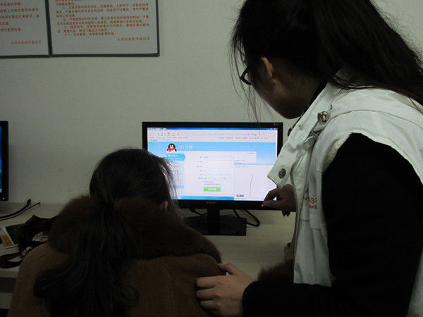 首先社工教大家申请QQ号,一边看大屏幕,一边动手操作,不懂的还可以看教材或者直接询问社工。紧接着,在社工手把手的教学下,每一位组员都申请了属于自己的QQ号,并将自己的QQ账号和密码记下。注册完成以后,在社工的提示下,每一位组员便开始登陆QQ,组员间互相添加好友。在社工的帮助下,学会用手写输入法聊天。