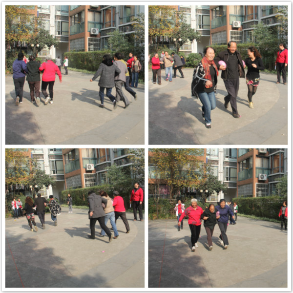 “开始!”一不留神儿,爷爷奶奶们已经开始游戏了,这也忒快了点儿吧!咱们先看看这游戏一“勇往直前”,一听这名儿,太…有感觉了。只见一块用红绳划分出来的场地,三人一组,两两之间夹一气球,将气球完好无损地来回运送至起跑点,期间组员不能掉队,用时最短者获胜。别看这大爷大妈们上年纪了,这玩儿起来,那可是比年轻人还“疯狂”呢!