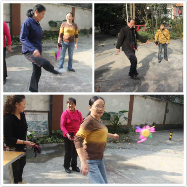 哟喂!看着,看着,都有点累了,采访一下刚从“战场”下来休息的奶奶们吧,“奶奶,这活动游戏好耍不呢?”“好耍,好耍,你看嘛,我一身都是汗水,待屋头无聊得很,出来活动多好,对身体好,人多热闹,我就住附近,喜欢参加你们开的活动……”话还没说完,这不,又踢毽子去了!