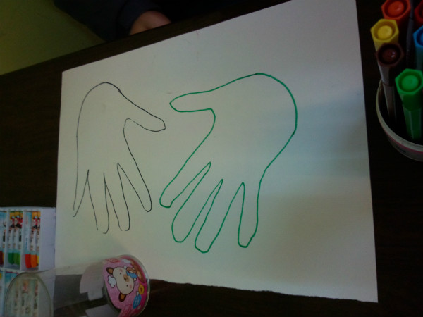 上午九点半左右,大部分“星儿”都已经在家长的陪同下来到活动点,进行课前自由活动,跟志愿者一起看书、聊天、做游戏,帮助他们更快地适应环境,为课堂活动做准备。为了让“星儿”尝试更多种类的绘画创作风格和技巧,本次活动我们选择了“手掌”作为绘画元素,“星儿”通过描绘自己的手掌轮廓,来感受手掌画的趣味和人机体的多种可能性。