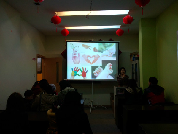老师带领“星儿”和家长一起感受神奇的手掌