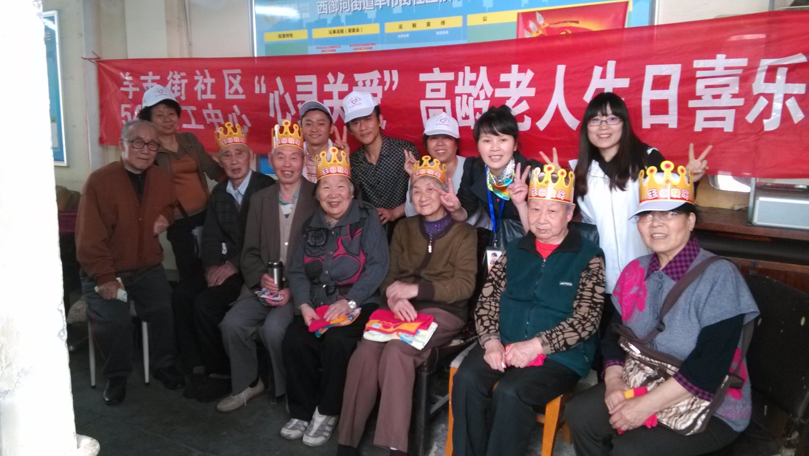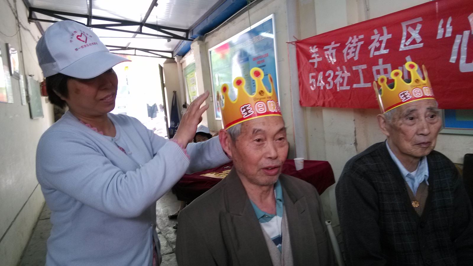 志愿者为寿星老人戴上生日皇冠