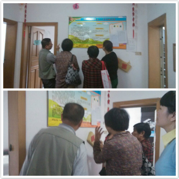 该研究项目工作人员以及其服务对象观看养老点活动栏,大赞543居家自助养老项目。