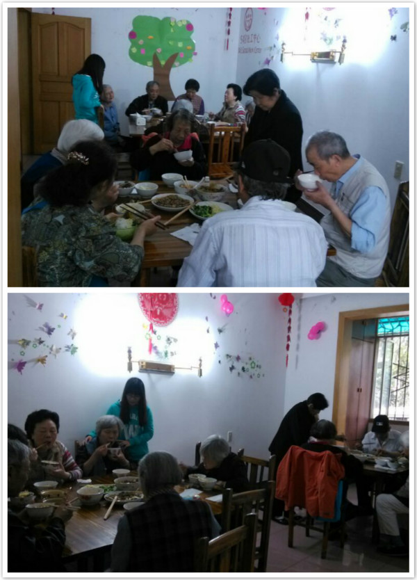 养老点老人阖家围坐,吃饭、聊天。