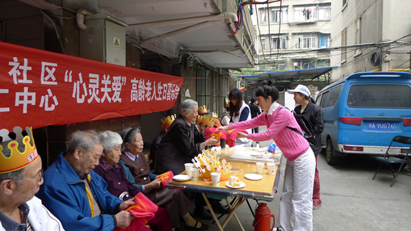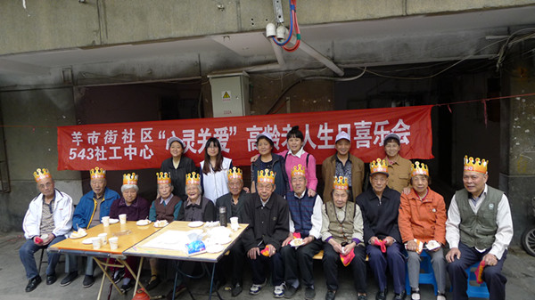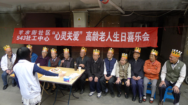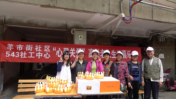 543社工中心“心灵关爱”项目之高龄老人生日喜乐会第九季——期颐之寿于4月23日在成都市青羊区羊市街西二巷6号院落欢乐开展。当天,除了12位寿星,还有9位社区志愿者参与到活动中。