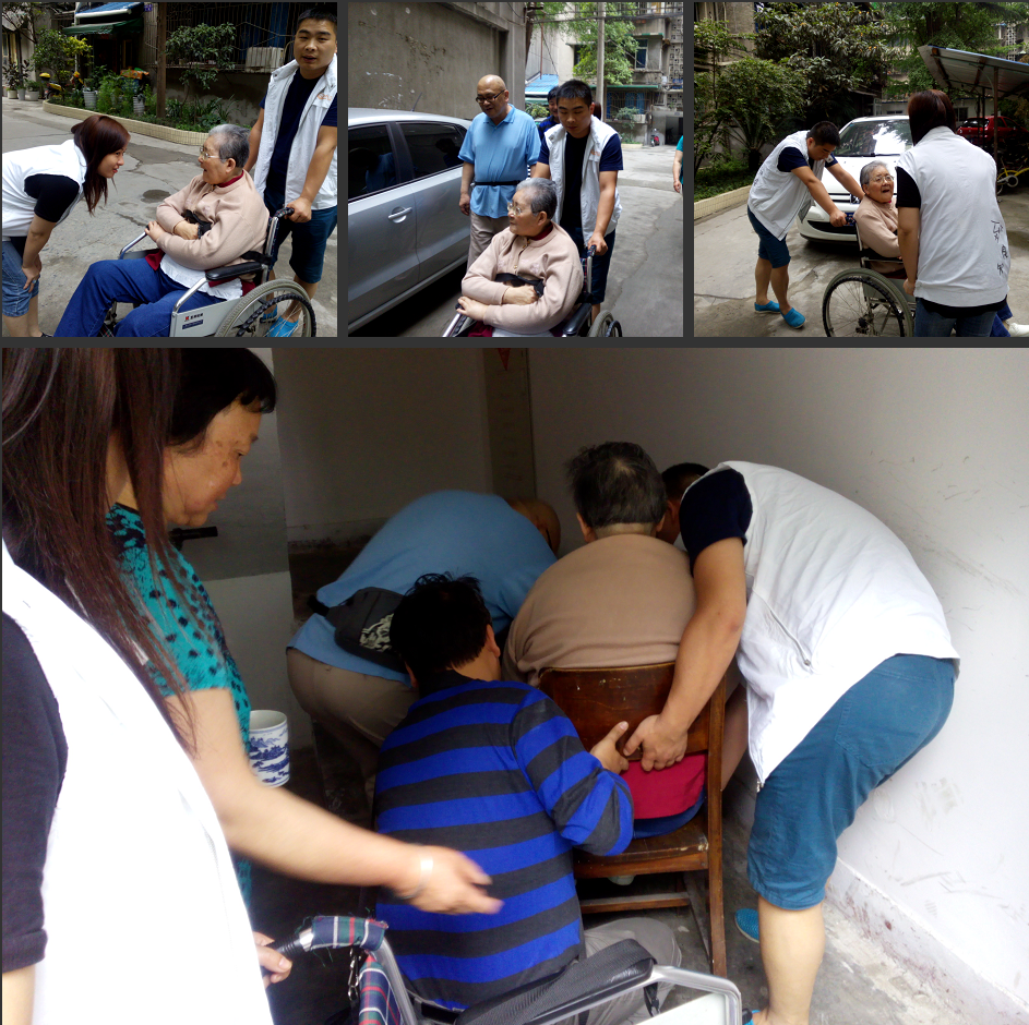 进驻西华门社区的花样盛年俱乐部工作人员社工小付得知了这一情况,主动联系西华门社区工作人员言明了这一状况。西华门社区刘主任在了解了具体情况后和社区工作人员前往王大爷家所在的院落和住房里进行了实地查看,并从王大爷口中知道老母亲很难得有机会能够出门更别说去医院检查。为此,社区刘主任亲自上阵,在2014年5月22日,先和所有的工作人员商量了事情的解决办法以及途中遇到困难的应对措施,做出决定后,带着社区以及花样盛年的工作人员齐心协力将吴婆婆从4楼抬下来,并送往医院。检查完之后,又组织大家一起将吴婆婆安然送回家。