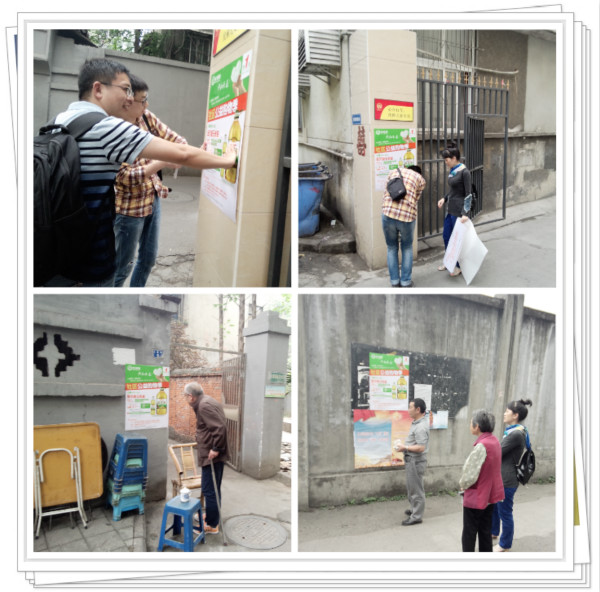 我中心全域网负责人与社工到社区各大院落张贴爱心公益购物活动海报,并为社区居民详细介绍此次活动。