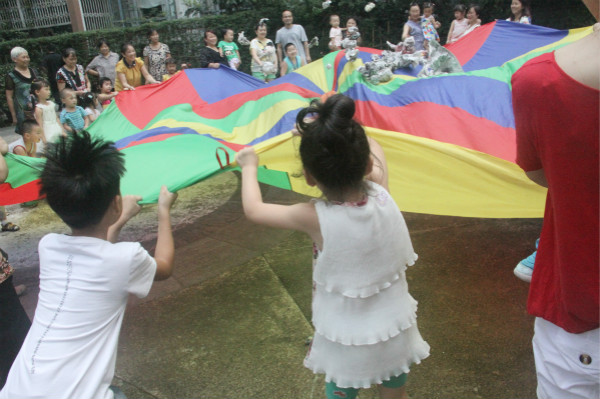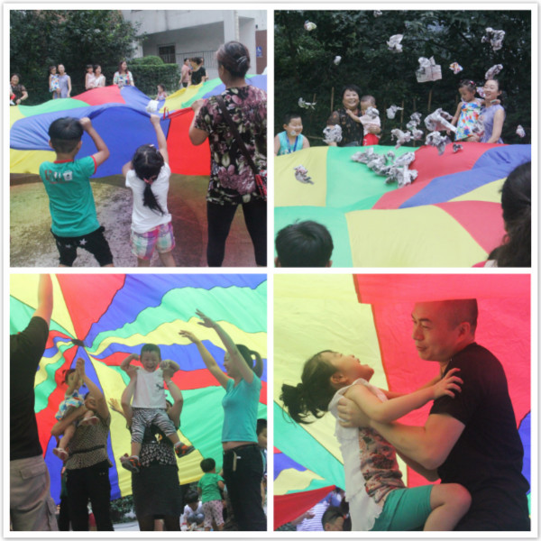 破冰游戏——爆米花,孩子们和爸爸妈妈一起拉着彩虹伞,转圈圈,蹦蹦跳跳,“爆米花咯!大家一起爆米花!”孩子们将报纸揉成的纸团扔进这个“五彩锅”中,和爸爸妈妈一起“翻炒”,直至“米花”都爆出“锅”外。自由翻腾的“米花”,应和着孩子们爽朗的笑容,那画面实在太美!
