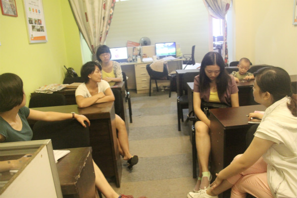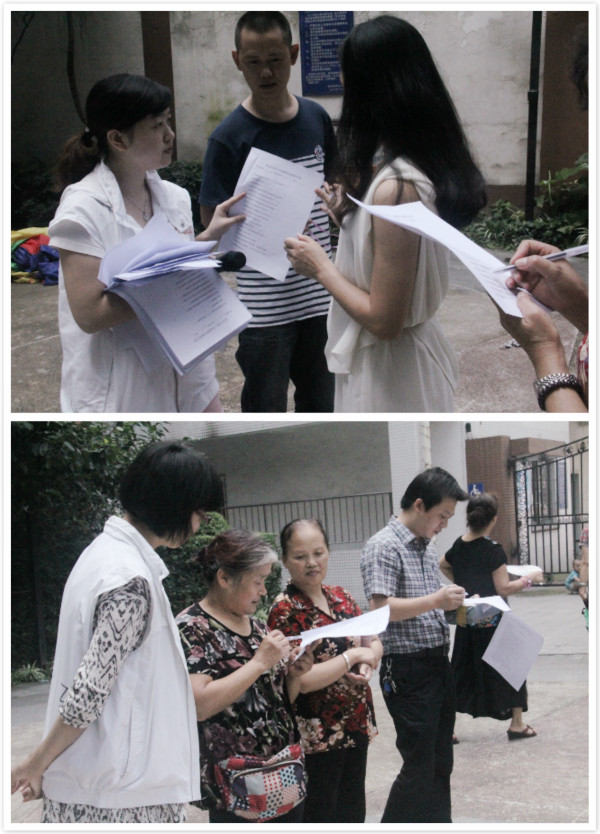 社工为家长们分发关于亲子关系的调查问卷,家长们认真填写。