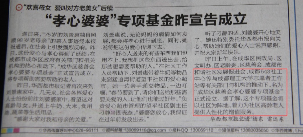 近日,由中共成华区宣传部发起的有关“敬老爱老、自强不息、孝道文化”的宣传号召,543社工中心做出积极响应,成都主流媒体已对此事进行了相关报道。