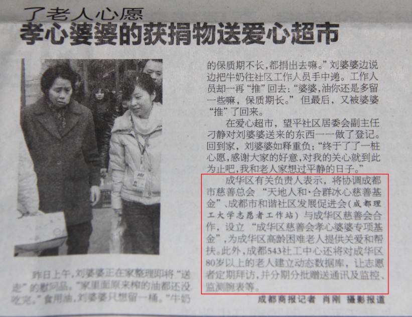 由“孝心婆婆”引发的爱心效应,543社工中心将独立承担为成华区高龄困难老人提供关爱和帮扶。此外,543社工中心还将对成华区80岁以上的老人建立动态数据库,让志愿者定期拜访,并分期分批赠送通讯及监控、监测腕表等。