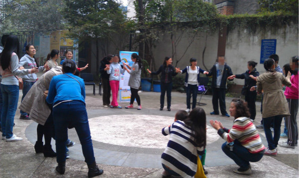 随后,志愿者带领“星儿们”到户外和家长们一同进行热身游戏,与“星儿们”进行拍手歌游戏,然后所有人手牵手唱起了儿歌。“星儿们”非常地开心,有的家长激动地眼噙泪水,一个劲儿地感谢社工,感谢志愿者们。