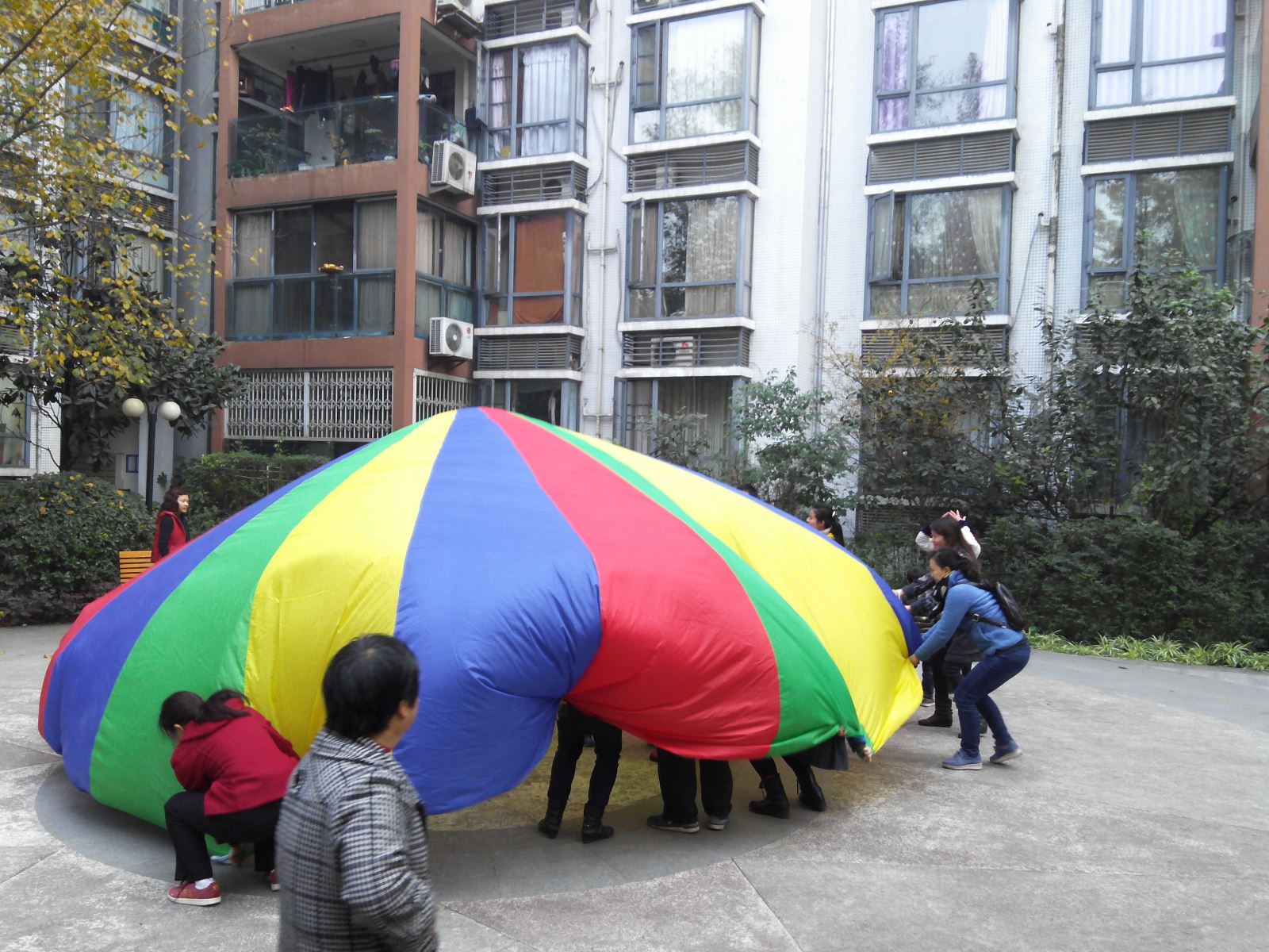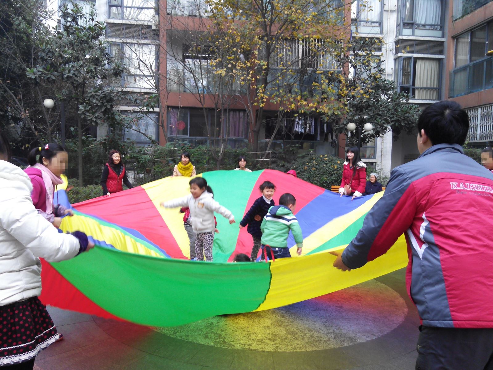 有了12月1日的关爱活动,社工们发现,“星儿”们对“彩虹伞”有极大的兴趣,因此,社工们把彩虹伞游戏当做这期活动的课前热身游戏了。游戏中,“星儿”们的参与度非常高,整个过程情绪都很积极。