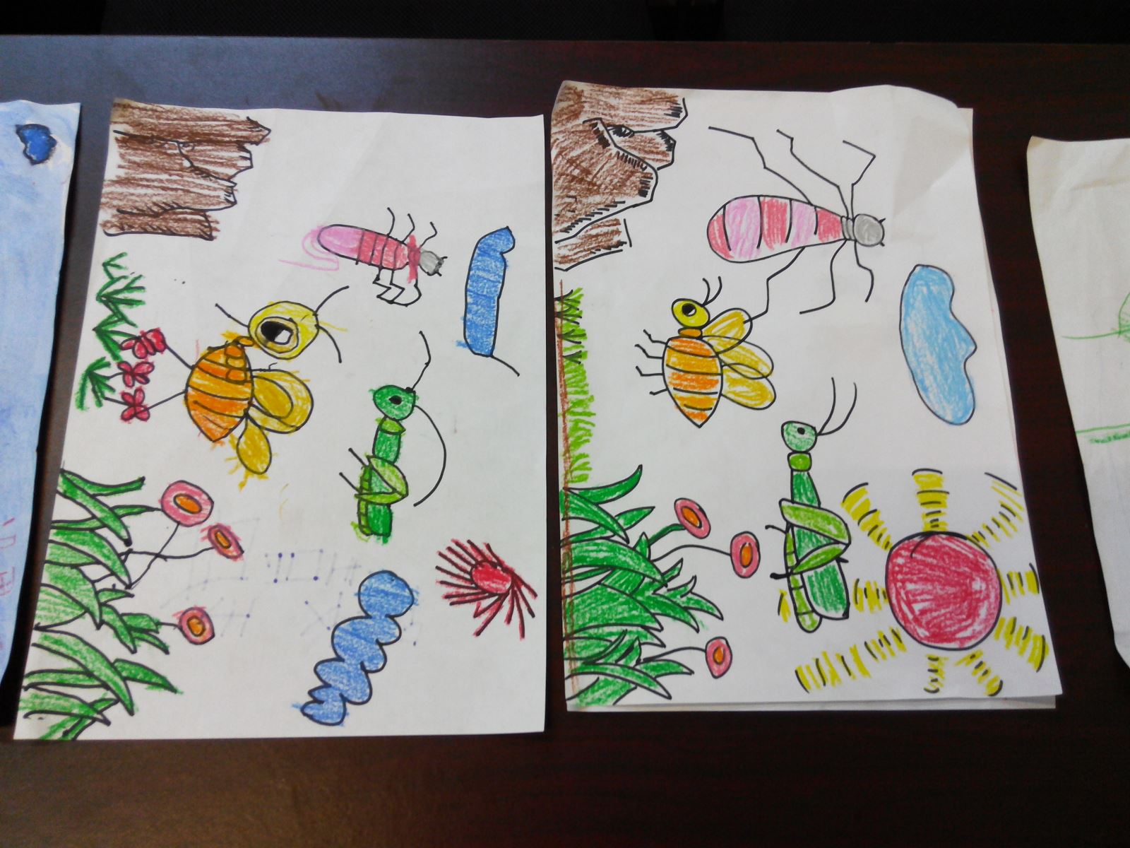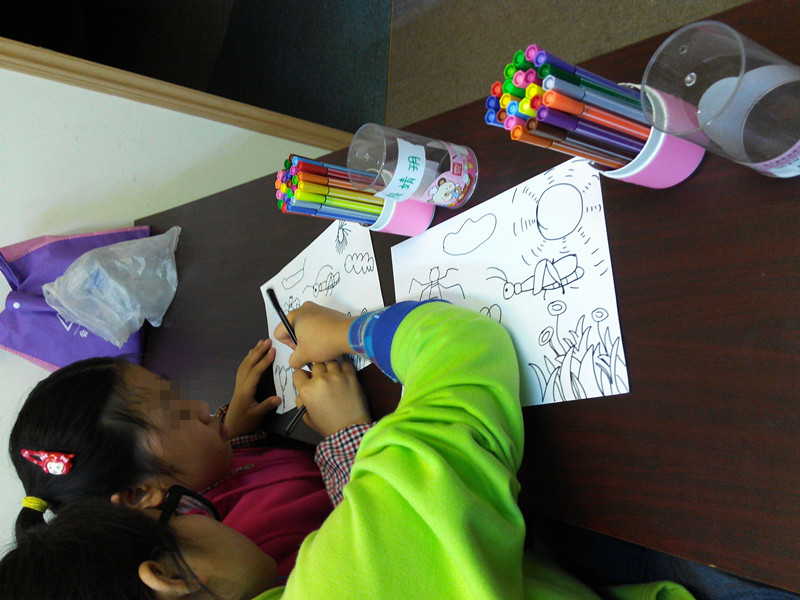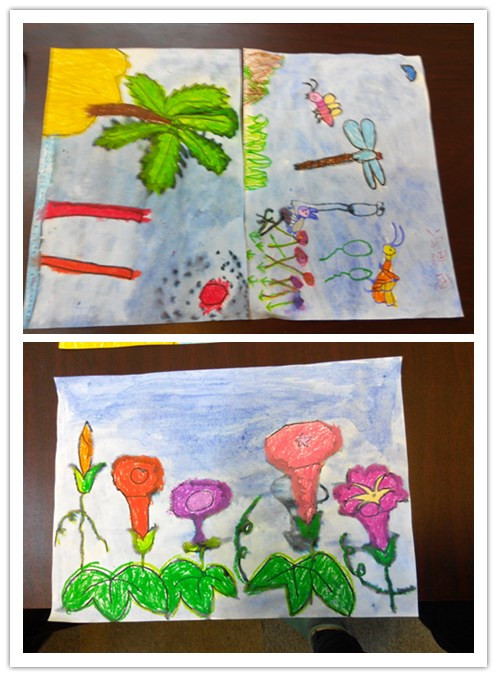 课前游戏结束了,简单的休息后便开始了此次的课堂。老师利用水粉和蜡笔不相融的原理,用水粉涂在事先用白色蜡笔画好的画上,将图凸现出来。在这个神奇的小魔术中开始了此次的活动。老师将画好的各个主题范画贴上黑板,然后给孩子们一一介绍,随后便让孩子们自由作画,用手中的笔将心中最美的场景描画出来。