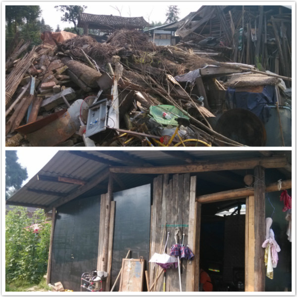 地震时,房屋倒塌,现落红左一家住在简易搭建房里